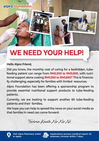 “Since we started this sponsorship programme in 2019, and we have now supported over 250 patients. Collectively, we have helped patients’ families save about RM6.13 million on oral nutritional support. Thanks to the continuous support of Alpro Pharmacy’s customers, we are currently looking to support another 60 tube feeding patients from any part of Malaysia,” said Ostwin Paw, Chief Executive Officer of Alpro Foundation.