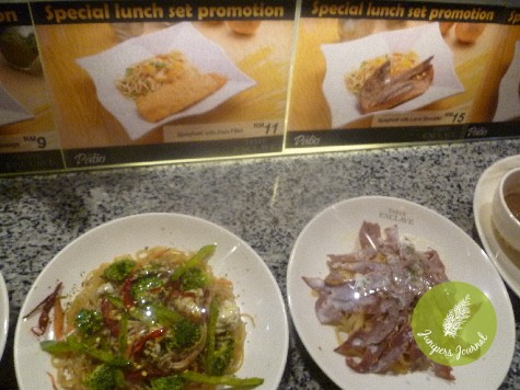 Barely 24 hours after lunch at The Patio yesterday, I found myself back in front of their counter, seemingly unable to resist the value-for-money dishes. I was about to order the linguini beef carbonara when I saw their lunch set specials which I hadn’t noticed yesterday. There’s spaghetti with fish fillet @ RM11, spaghetti with jumbo sausage at RM9, spaghetti with lamb shoulder @ RM15 and spaghetti with salmon @ RM15. I chose the salmon set because for goodness sake, where are you going to find this kind of set for RM15?
