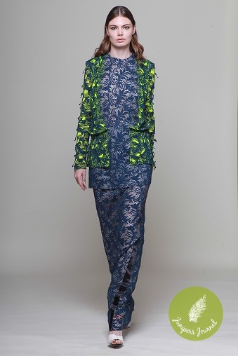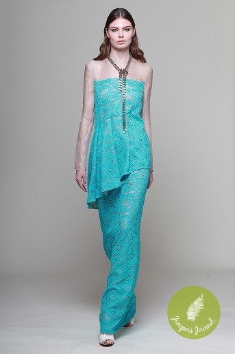 His Petang Raya 2015/16 is current, retaining the femininity and full-on glamour. There are some lace-on-lace designs which created a whole new effect and he has introduced lace patching in a whole new fun way. The ‘kurung’ cut is updated to look more like blouses and standalone dresses with some designs spotting a sports jacket trend. There are embellishments but they are introduced as stripe patterns.
