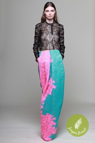 The colour palette for this season is a play of black and fluorescent hues, from shocking pink and lime green to bright turquoise. He was inspired by the colours on his daughter’s T-shirt. The challenge was to experiment on these colours and still retain the glamour on my Petang Raya collection.