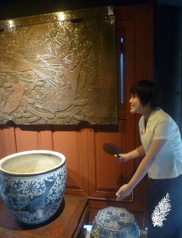 After the garden tour, our guide showed us a print template (image above) which is the same image as the huge vase below the template. Jim Thompson was very inspired by Thai and Chinese artifacts. There are many antiquities around the house and I was told there are a lot more, displayed on rotation. Not everything in the house is Oriental, there are chandeliers in the small dining room. No photo taking is allowed inside the house and we had to take off our shoes before entering the house proper so as not to damage the marble floor. Bags have to be left in the lockers which is just as well as you wouldn’t want to risk knocking over anything!