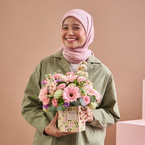 Open up a box of sunshine and smiles! Packed with green eustomas, pink gerberas, and peach matthiolas, the Emery Mimipikita x BloomThis Hatbox is a playful nudge to keep those smiles coming. Its radiant blooms echo Emery’s cool and attentive nature.