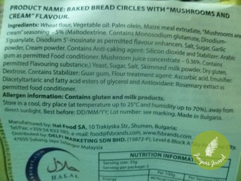 Bruschette Maretti products are olive oil-oven baked, bread-based snack, no artificial flavors or colors added. This packet of 70g is mushrooms and cream flavoured, can be quite addictive as you may not even realize you have devoured the entire packet.