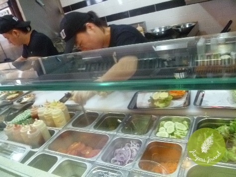 The first thing one does is pick either beef, turkey, veggie, chicken and which type of cheese to go on top of the protein. Then you decide whether you want it in a bum or bowl. Next you move along the line and choose whatever vegetables you want together with as many sauces as your heart desires. Premium toppings are available at an extra charge.