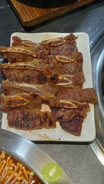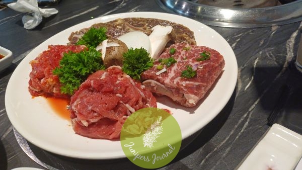 For the meats, we were served the Dae Ga Marinated Beef Set (for 3-4pax) which consists of Marinated Beef Short Rib 1pc/200g+ Marinated Beef Sirloin 240g (2 flavors) + Lateral Cut Marinated Beef Short Rib 160g. Okay, I admit I wouldn’t be able to tell what cut of meat is what but luckily, we have the friendly and helpful staff on hand who can answer our questions as he grills the meat. Come to think of it, I wish I had a staff like him when I go for steam boat.