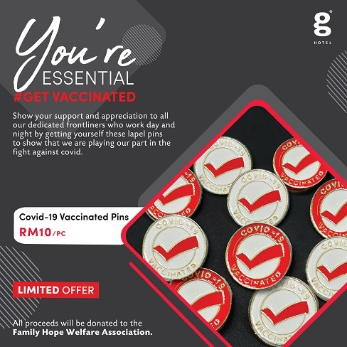 “The Covid-19 Vaccinated Lapel Pins shows our appreciation to vaccine recipients as well as frontliners and helps to create a sense of assurance and positivity within the community that we are playing our part in the fight against COVID. Not only that, we are also grateful that, with your support, we’ll be able to help families and individuals in need” said G Hotel’s General Manager, Michael Hanratty.