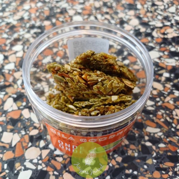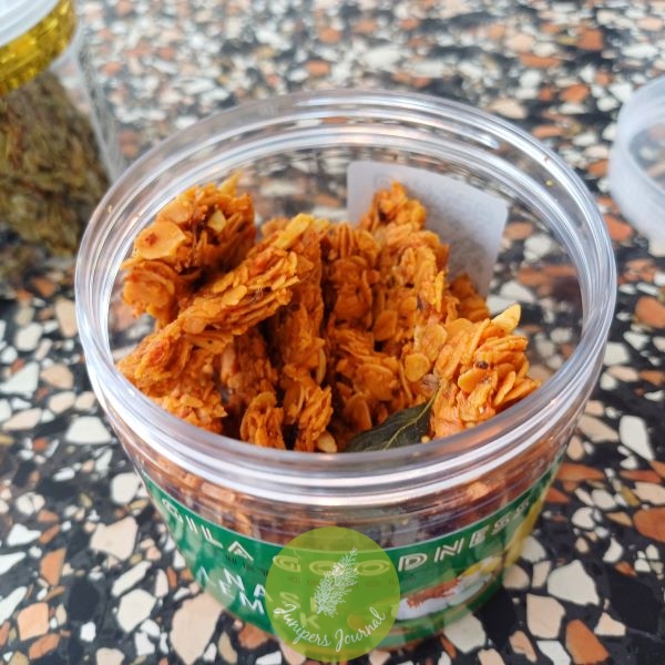 Made with rolled oats, whole almonds, crunchy groundnuts, shredded coconut, ikan bilis, and baked with a coating of Gila Goodness’ signature sambal blend, these granolas are really crunchy and wonderfully savoury. It’s a great alternative to a plate of nasi lemak as you get the genuine taste of nasi lemak condiments sans the rice. The fragrance of coconut makes them very appealing.