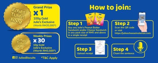 Would you believe it if we told you that buying biscuits for RM5 can potentially get you gold? Yes, you heard it right! Your chance to win 100g or 10g of Julie’s custom gold starts today. In response to the overwhelming positive feedback from last year’s contest, Julie’s is thrilled to bring back their nationwide Cheese! I ‘Nut’ Emas contest for the second year running. This year’s contest is bigger and better than before with more prizes up for grabs and a higher total prize amount of RM150,000.