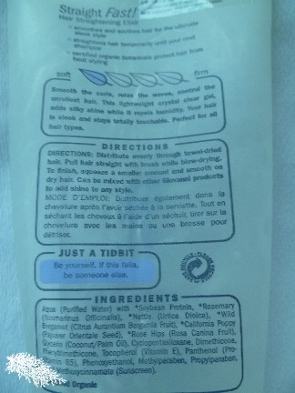 Straight Fast!™ Hair Straightening Elixir is a clear gel which straightens hair temporarily until your next shampoo. I apply a bit of it through the lower half of my hair after I’ve towelled dry. It’s quite sticky and this isn’t something I like because it tends to clump my hair together.