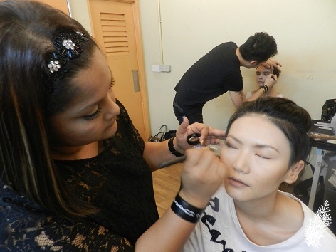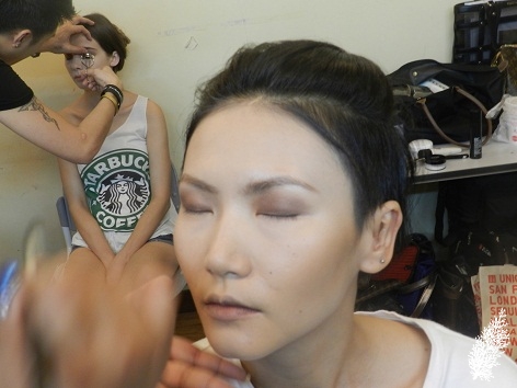 Going backstage prior to fashion shows is always fascinating as I get a privileged peek into the hustle and bustle that goes on and witness the preparations of the models and stylists. It’s a lot of hard work especially for the makeup artists from MAC Cosmetics at Khoon Hooi’s Spring/Summer 2013 Show a few days ago. Their call time was 9.30 am. Okay, it’s not that early but I can see they have to work feverishly from the time they get to the venue. At Khoon Hooi’s Spring/Summer 2013 Show, there were 6 MAC Artists working on 20 female models including the very tall, elegant and definitely someone who deserves the “supermodel” tag, our very own Gwen Lu who has achieved international success. Haritha Shan answers questions about the make-up look for the Show in between doing the make-up for Gwen.