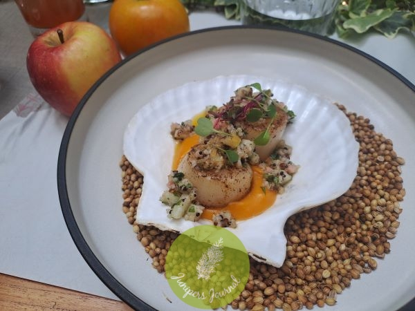 Pan seared Hokkaido scallop, butter squash puree, quinoa, Kissabel apple, Montpellier butter