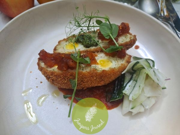 Corn fed minced chicken, Celeriac Slaw, Basil & parsley pesto served with Gala apple chutney