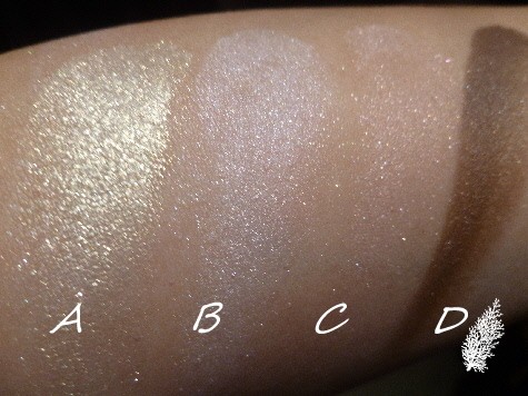 Gold isn’t just the predominant colour of the shadows. Gold is also part of the formula as the shadows contain two unique gold pearl powders – Real Gold Pearl, a pure gold pearl powder with 0.1% 24k Real Gold and Nuance Gold Pearl, a bright pearl powder with a hint of gold. In each palette, the Real Gold Pearl is in the shadow on the top left hand corner and the Nuance Gold Pearl is in the shadow on the bottom right hand corner of the palette, i.e. the shadows marked ‘A’ and ‘C’ respectively in the images below.