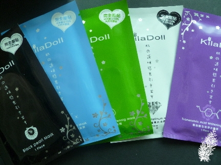 About 2 months ago, I spotted the Kila Doll masks at Guardian, MidValley. I think it must have been instore for only a week then. There are 5 varieties altogether not including the trial pack which includes one of each variety. Each variety comes in a box of 10 for RM39.90 while the trial pack is priced at RM19.90. I’ve only started using them this month when I got bored of using the My Beauty Diary masks from the Firming & Whitening Set.