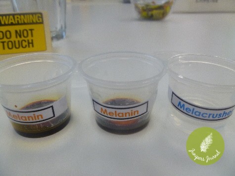 During the introduction to the range, each of us had 2 test tubes on our tables and containers of Melanin and MelaCrusher™. The objective is to show the effect of MelaCrusher™ on Melanin.