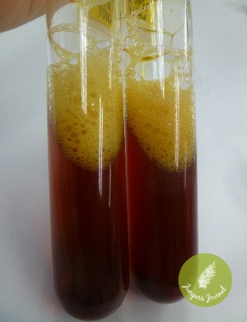 Next we emptied the MelaCrusher™ tub into one of the test tubes to compare the difference. Note the colour of the liquid in the tube on the right as it contains the MelaCrusher™ mixed with the Melanin.