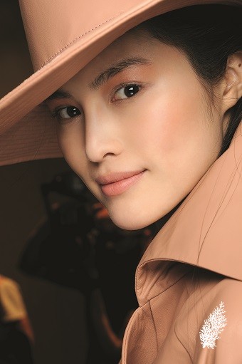 The look is effortless and clean. To create light reflects on skin, use a cellophane tape to create a line of light on the face. It’s like a mannequin effect, playing with new texture. Gloss is used on eyelids and under eyes. Lips are left nude.