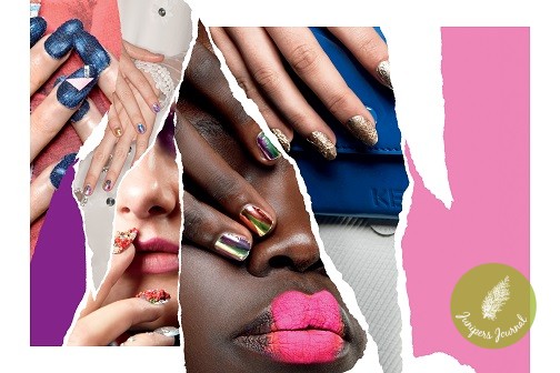 For Teen Spirit, it’s glitter and shimmer all the way. There’s a cornucopia of colour and texture that takes embellishment to another level. Nail art is at its most egalitarian. Nails can be anything from kawaii to grunge. With fabric, glitter, foils, collage and embellishments, it’s an explosion of artistic mediums and references.