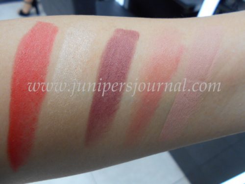 Only 2 out of the 5 lipsticks show strong colour, the rest look rather pale. The lipsticks are RM82.