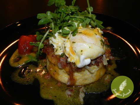 corned beef, grated potato, English muffin, poached egg, spiced hollandaise sauce, pea sprout