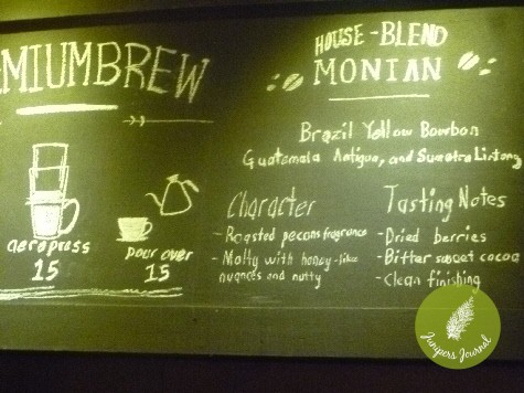 The House Blend is called Monian and it contains beans from Guatemala, Brazil and Bali. It has a roasted pecan fragrance and nutty flavor, my Flat White was rich and thick. Very well made, I could find no fault with this cup of coffee.
