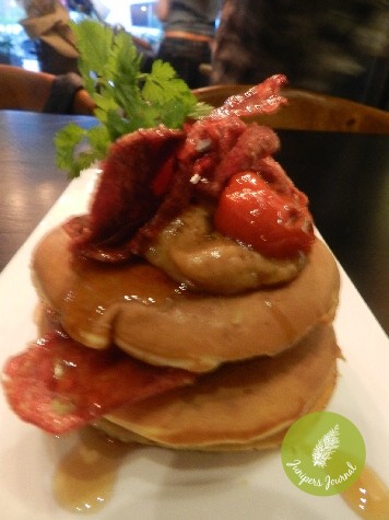 Fluffy pancake with crispy beef bacon, maple-peanut, butter syrup, roasted tomato