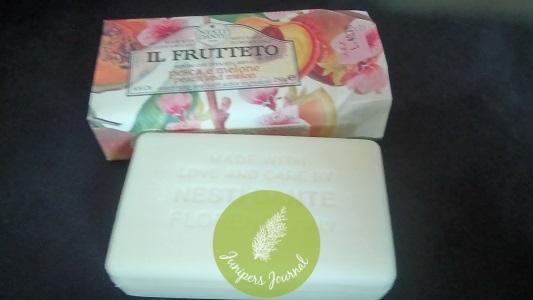 This soap has a peach and melon scent. There are other Il Frutteto variants such as citron & bergamot, fig & almond milk, medlar & jujube, mint & quince pear, olive oil & tangerine, pomegranate & blackcurrant and red grapes & blueberry. I am sure they all smell just as wonderful as the peach & melon.