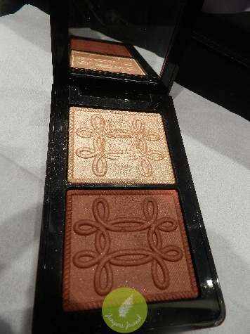 MAC Nutcracker Sweet Sweet Copper Face Compact consists of Extra Dimension Skinfinish in pale gold and a peachy brown shade of Extra Dimension Blush. Apply the blush first followed by the Skinfinish as highlighter. It’s not as brown as it looks in the pan. Just look at it on my cheeks….