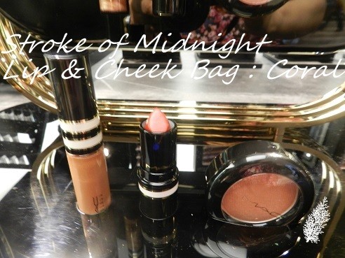 My favourite set which is the Stroke of Midnight Lip & Cheek Bag : Coral as it has a smaller sized neutral peach blush which suits every skin tone and a gold frost lip gloss which tones down the redness of the red frost lipstick.