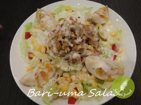 Now here’s a salad with a difference. Some of us may shy away from salads because aren’t they all about vegetables? This Bari-uma salad will appeal to the carnivore in some of us as it has shredded “chashu” on top which really adds to the intensity of flavours. There’s egg slices with a slightly runny yolk, crunchy lettuce leaves, lots of corn but this would have been an ordinary average salad if not for the yummy “chashu”.