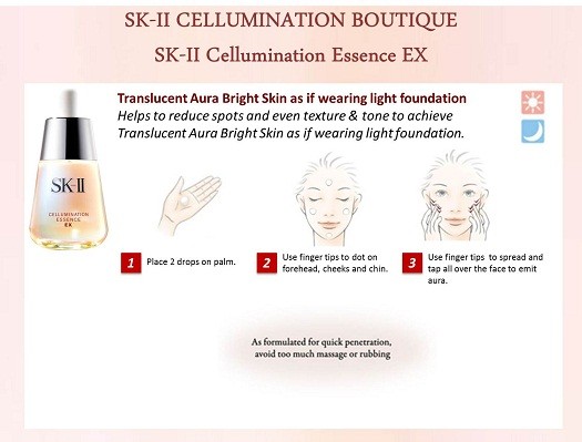 These 2 products have the highest sales numbers within SK-II’s whitening products and Cellumination Essence EX is the first product within SK-II to achieve the aura effect, i.e. a brilliant translucent aura that redefines spot free bare skin beauty.