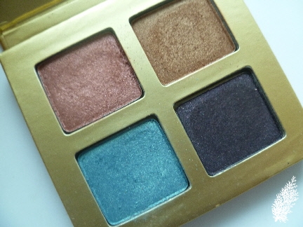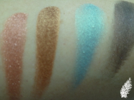 There is a rusty-red, bronze, teal and dark purple which don’t even need to be used wet for intensity. I like the 1st 3 colours a lot but the dark purple has to be used sparingly like just on the outer corners of the eyes to avoid my eye looking bruised.