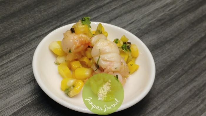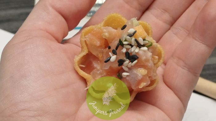 Chef Peter demonstrated 2 dishes: firstly, Abrolhos Western Rock Lobster, Sweetcorn & Shio Kombu Butter and secondly, Pie Tee of Salmon Tartare, Yusheng Flavours.