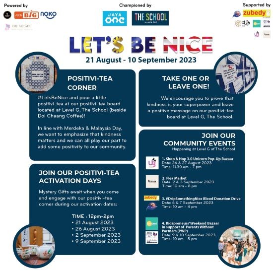 The School by Jaya One has successfully rolled out a month-long campaign, themed ‘Let’s Be Nice’ from 21 August – 10 September 2023 to cultivate positivity and kindness within the community in line with Merdeka and Malaysia Day.