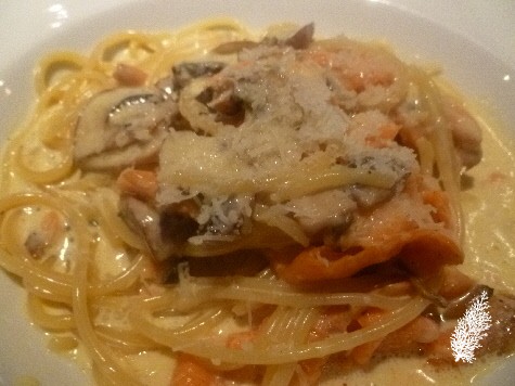 Next to arrive was the pasta carbonara with smoked salmon. I’m not that keen on pasta dishes with smoked salmon as they generally turn out to be too salty which was the case here. With any pasta dish with smoked salmon, they’ve got to go easy on the salt for the sauce or pasta as the smoked salmon is already salty.