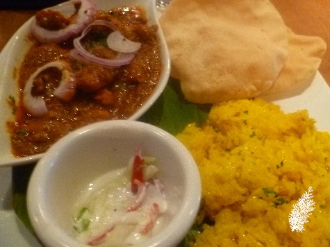 My chicken tikka masala was the last dish to arrive. There was a minute amount of cucumber raita, so minute that it was probably a spoonful. The chicken tikka sauce was lovely and I wish I had some bread to go with it. The chicken itself was probably from the thigh, it was kind of rubbery but not tough. I think there were too many tendons in the meat so I didn’t finish the chicken. The yellow glutinous rice was delicious and really filled me up.