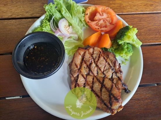 For the main course, I ordered the Guinness Barbecue Pork Collar @ RM28. The pork collar is marinated overnight with guinness beer and herbs, then grilled and basted with guinness. It is served with butter vege, grilled tomato and comes with homemade spicy bbq sauce.