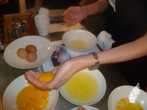 Team Pavlova was very fortunate to have Chef Nathalie guide us while her assistant guided the other team. Chef Nathalie demonstrated how to crack open an egg using another egg and sliding the egg yolk on to one palm while opening up the fingers slightly to allow the egg white to slip through into the bowl, then quickly drop the egg yolk on to another bowl. It’s tricky but most of us got it right. You just have to be fast and not hold the egg yolk in your palm for too long otherwise the yolk will definitely break. It’s a little time-consuming and frustrating but with practice, I am sure everyone will be an egg white sifting expert. Each egg white weighed around 35g so we needed quite a number of eggs for 20 mini pavlovas.