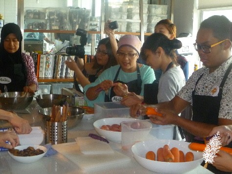 What better way to celebrate Melvita’s 30th Anniversary than with a smashing organic cook-up at Nathalie’s? This was much better and innovative because we could learn how to prepare the main course and dessert from the recipes distributed to us. Not quite Master Chef since there was no pressure on each individual. Those of us who arrived on time had to wait almost an hour before we were ushered into the kitchen. That’s Malaysian time for you – some participants strolled in 45 minutes late. I wonder if unpunctuality is imprinted in most Malaysians’ DNA? Of course in KL, it’s so easy to blame it on the traffic but if the unpunctual participants were on Master Chef Anywhere, I’ll bet they’d have been disqualified even before they could touch a single ingredient. When it comes to organising any meal, whether the guests are VIPs or not, time is of the essence, something that will never get through to some people. What irks me is that by the time I’ve been sitting waiting around for an hour for people to arrive, I’d already have incurred an hour’s parking fee which may not seem like a lot but add that to many other occasions when I’ve had to wait around for an hour and you’ll see that all adds up to a considerable amount.