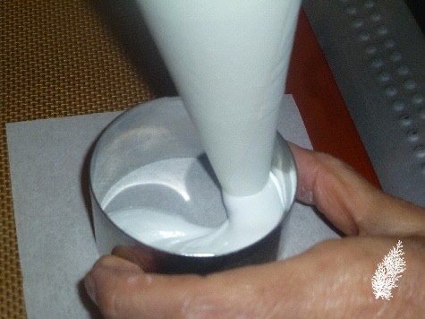 Chef Nathalie showed us how to use a piping bag to pipe the mixture into egg rings placed on top of baking paper. Pipe almost to the top of the ring, use a spoon to flatten the top and smooth to the edges of the ring, then use a knife to separate the mixture from the ring making sure not to sway the ring. The ring has to be removed in one swift, smooth, straight motion. Easier said than done but again with practice, everyone can be an expert.