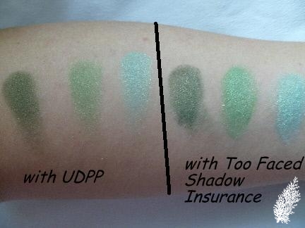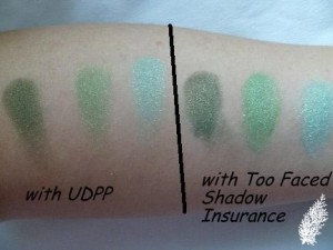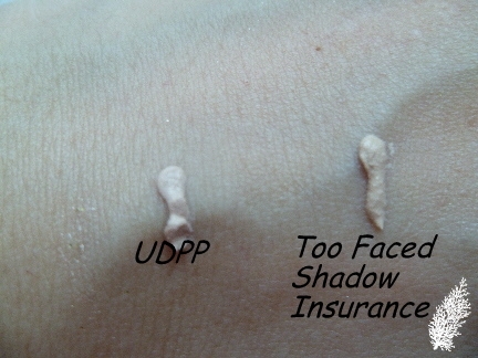 When I washed my hand with soap and water after swatching the blue eyeshadow (in the pic above), the last to come off was the eyeshadow + UDPP. I had to really scrub to get it off whereas the eyeshadow + Shadow Insurance came off almost as quickly as the eyeshadow only. I much prefer UDPP over Shadow Insurance.