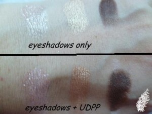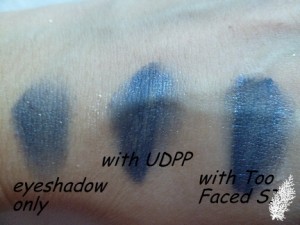 Looking at the pics above, there doesn’t seem to be much difference between the effect of UDPP and Too Faced’s Shadow Insurance. I found UDPP’s texture to be slightly thicker but still it applied seamlessly and in fact, absorbed and dried a bit quicker than Shadow Insurance.