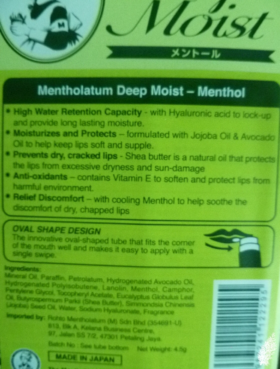 Mentholatum introduces its latest lip balm, Deep Moist in an oval tube. It looks like a lighter actually, the tube is dark green and it’s very lightweight. It has the unique oval shape so that it won’t roll away on a flat surface and to fit the corner of the mouth well.