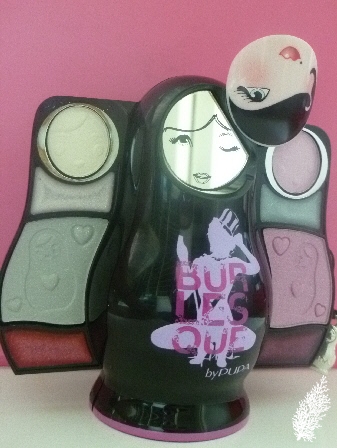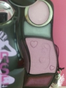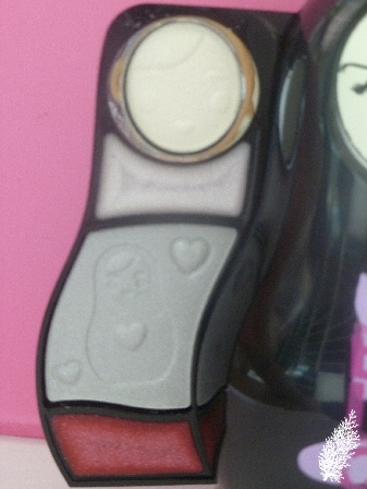 Rotate the doll’s face and you’ll see a mirror, tug at the silver chain at the right side of the doll (the chain incidentally is in the shape of the doll, how clever is that!) and you’ll find 2 eye shadows and 2 lip glosses. The left side of the doll doesn’t have a chain but there’s a tiny crack on the doll’s side for you to pull and it’s the same number of eye shadows and lip glosses there. Of course, one has to pull on the chain very,very gently as I don’t think this is a sturdy product by any stretch of the imagination! Different color dolls have different color eye shadows and lip glosses.