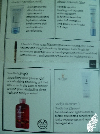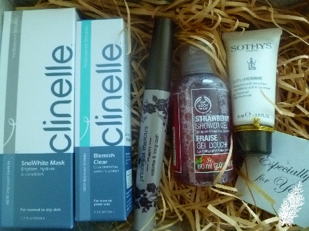 L to R – Clinelle SnoWhite Mask 50ml, Clinelle Blemish Clear 15ml, Elianto Princezna Mascara 7g, The Body Shop Strawberry Shower Gel 60ml, SothysHomme Detoxifying Active Cleanser 15ml