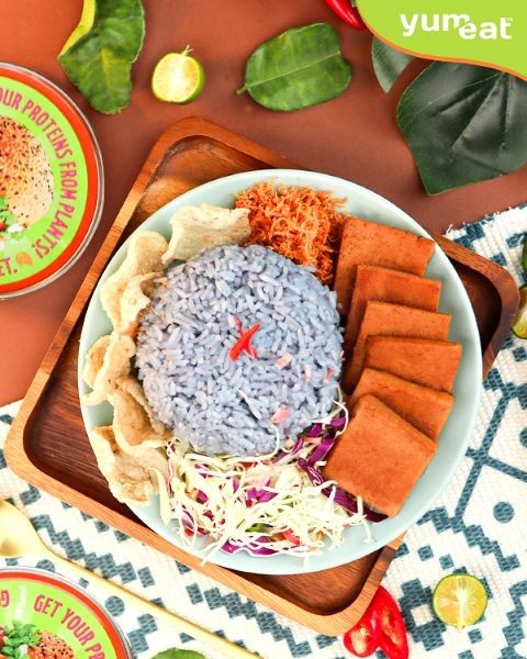 Jazz up your basic Nasi Kerabu (Blue Pea Flower Rice with raw local herbs and vegetables) by serving it with a side of pan-fried yumeat plant-based luncheon meat. Cube or cut the yumeat before pan-frying. Local, delicious, and nutritious.